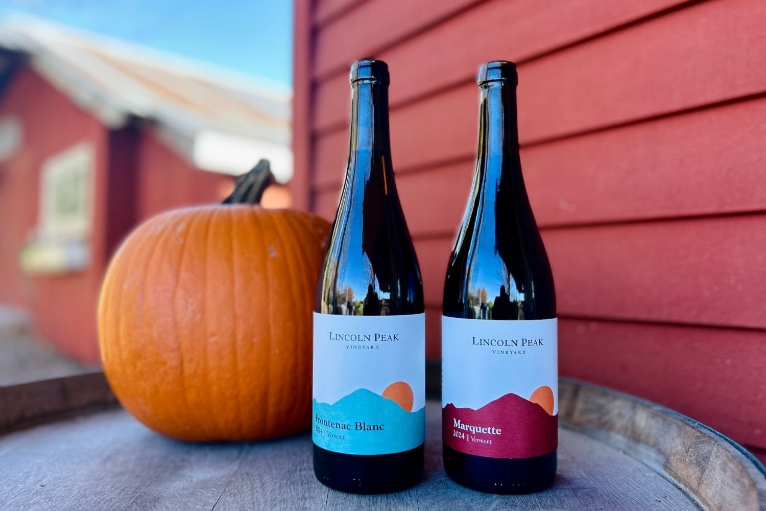 A bottle of 2024 Lincoln Peak Vineyard Frontenac Blanc with a teal-blue label and a bottle of 2024 Lincoln Peak Vineyard Marquette with a red label sit on a barrel in-front of a pumpkin with the red-sided tasting room and blue sky behind them.