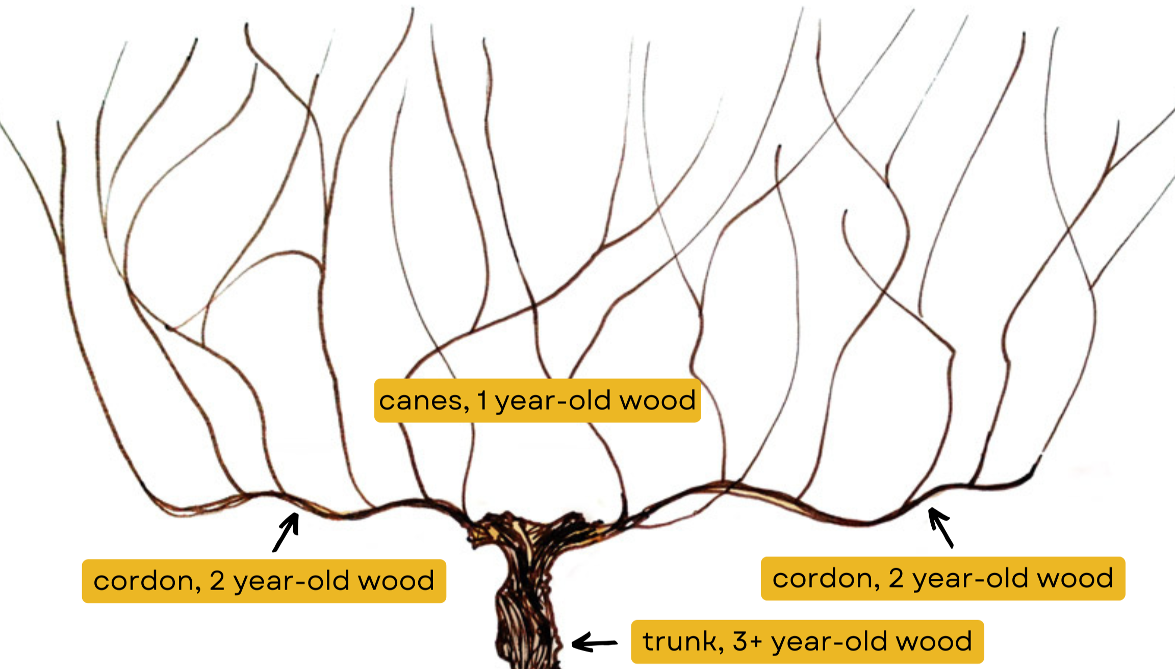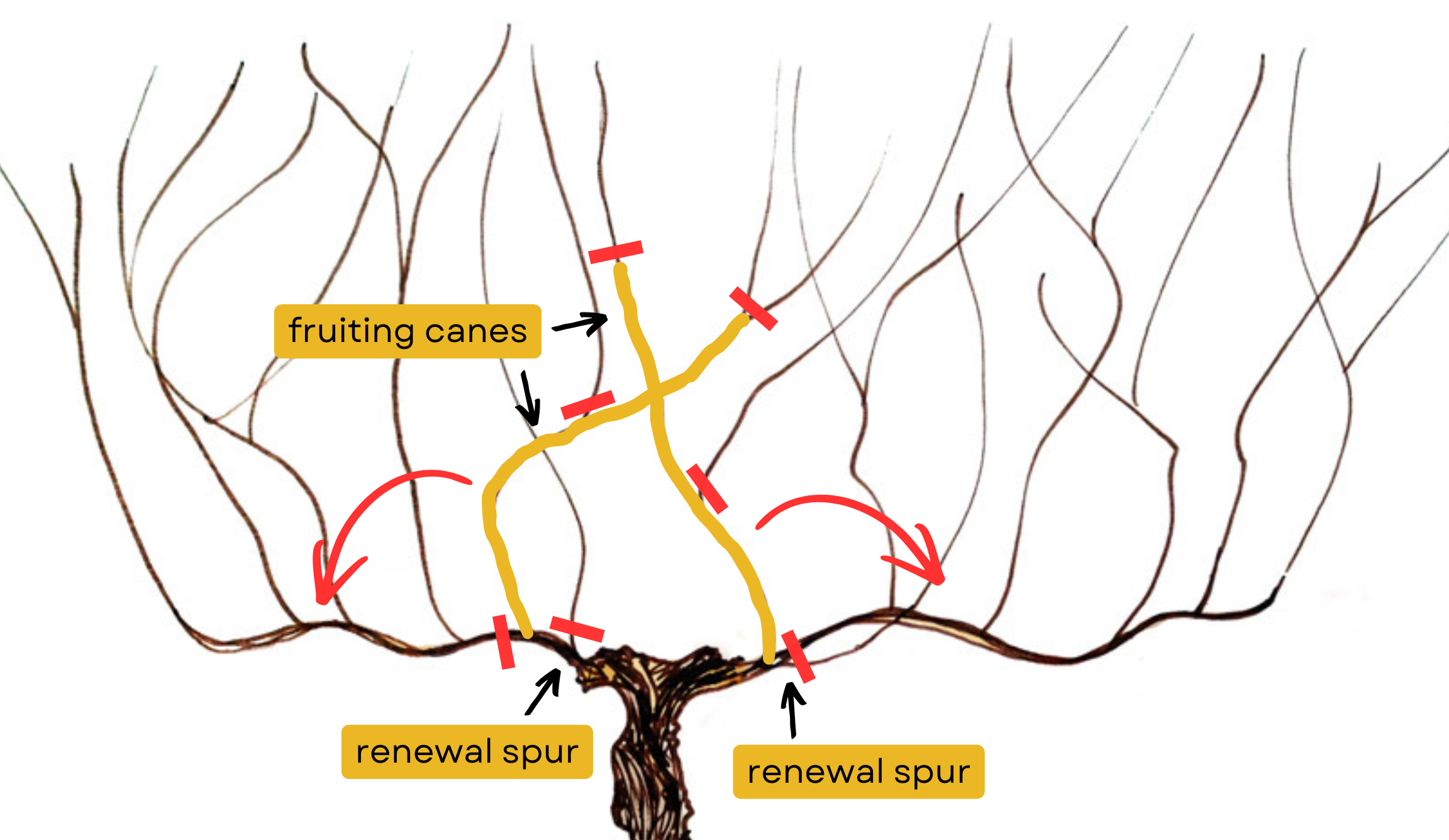 It’s important to understand that these vines are not particularly interested in growing delicious grapes and making great wine. Left to their own devices, they prefer to grow mostly from their tips, spreading wildly as vines do. Spaced evenly along each of the canes depicted above are dozens of buds from which new growth originates in the spring. If left unpruned, all of these buds would push, growing hundreds of new shoots stunted by a fierce competition for resources and supporting tiny clusters of grapes that would struggle to ripen in the crowded, humid, shady canopy. Yuck.
